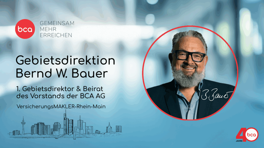 Ich bin Bernd W. Bauer, unabhängiger Finanz- und Versicherungsmakler, bei der IHK als Versicherungsmakler nach § 34d GewO und als Finanzanlagenvermittler nach § 34f GewO registriert und bin Founder von: „Die Maklermacher“ und „FiVeMa Netzwerk“. In meiner Funktion als Gebietsdirektor der BCA AG kenne ich sowohl den Alltag des einzelnen Maklers als auch die Sicht eines großen Maklerverbundes.
